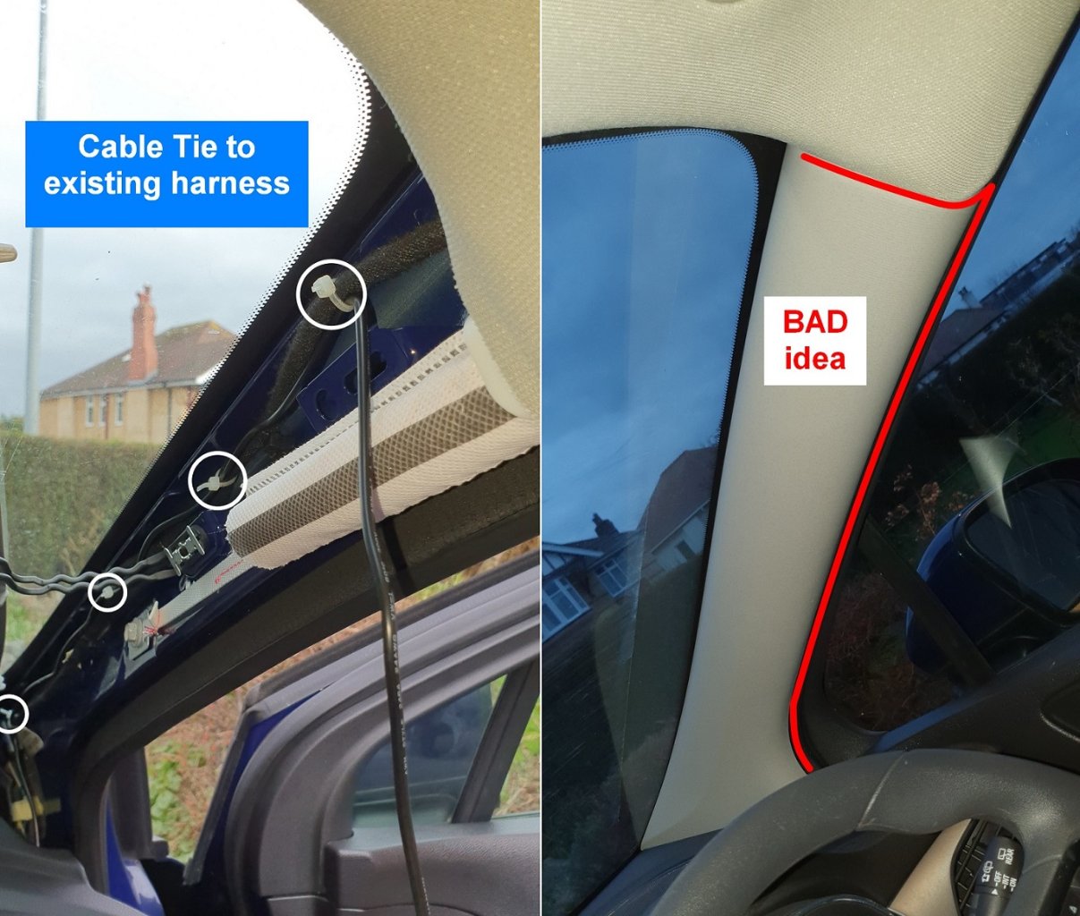 Jen doplním obecnou radu - pokud má auto stropní pytle (airbagy), tak určitě kabel ke kameře pečlivě uchytit stahovačkama ke stávající kabeláži... foto níže je z "Káčka"