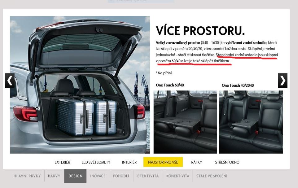 Pohoda. Pripajam screenshot z ceskej a slovenskej stranky Opel, ak sklapanie One Touch nemaju sedadla delene 60/40 ide o zavadzanie. V texte je jasne uvedene ze to tam ma byt.