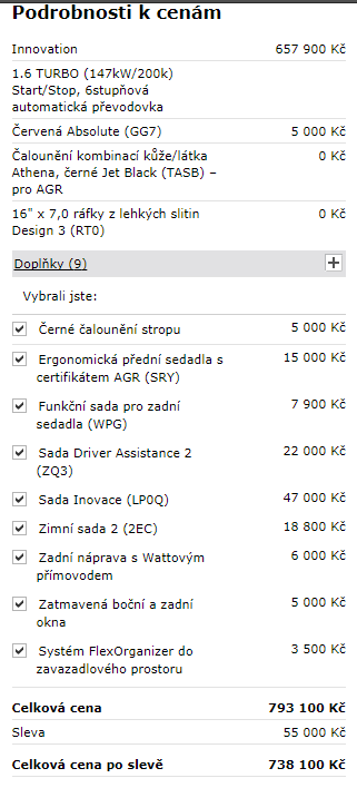 Tak cenníkovo je 1.6T AT na 658 000 s Innovation. Pridal som AGR obe, Sada Inovace (svetlá), Driver Assistance 2, Zimní sada 2, Zadní sedadla, Watt, Zatmavené okná, Flex do kufra, tak sme na 733k. Nedal som tam parkovací asistent... ten je mi síce úplne na draka, ale chcel som mŕtvy uhol a je to iba spoločne :( Ale bez toho si to viem predstaviť.