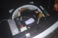celé to drží na skrutke v strede subwoofera, kde je normálne upevnená rezerva. Kábel ktorý ide zo skrutky je kostra k dorábanej 12V zásuvke na chladničku.
