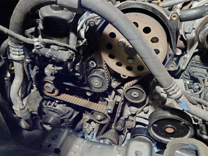 Patřím k těm, kdo vodní pumpu nevymenili při rozvodech. Jo, je pravda, že když je pumpa součástí rozvodů, je třeba jí vyměnit a i jsem to tak u Z19DTH dělal. Stejně tak, pokud je umístěná stejně jako na tom V6 na předchozí fotce. Ale tady je řeč o motoru B20DTH/D20DTH. A ten má pumpu mimo rozvody a navíc dost stranou, aby voda netekla do rozvodů. Přidám fotku, vodní pumpa je na pravej straně, ta drážkovaná řemenice. Věřím, že se nic nezkazí s tím, když se u tohohle motoru vodní pumpa nevymění. Až bude potřeba, tak se vymění, navíc zrovna taky levná není.