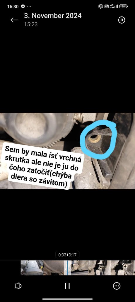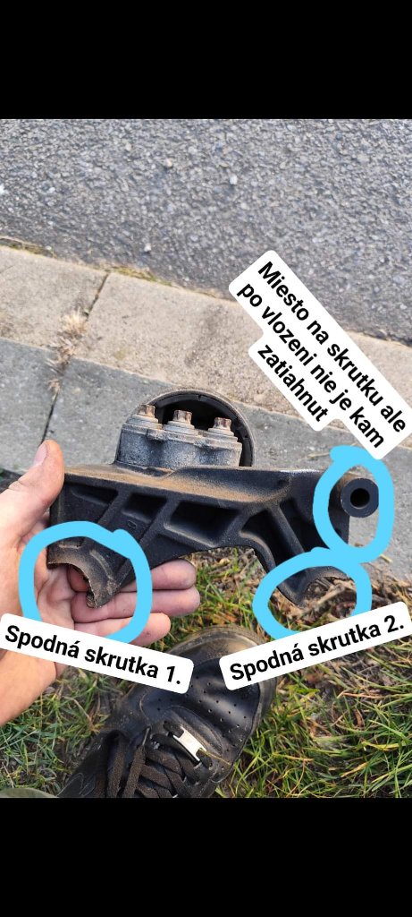 Ďalší problém ktorý to tiež môže spôsobovať je absencia tretieho šróbu na uchytenie držiaka. Pokiaľ sa pozriete na foto držiaku z uvedenej stránky, v spodnej časti má dve diery na šróby (obidve mi už 2x praskli) a v hornej ľavej časti držiaku je tretia diera na šrób, avšak ja na bloku motora nemám na tento vrchný šrób žiadnu dieru-akoby tam nikdy nebol vyvŕtaný závit, nerozumiem tomu. Tým že držiak je uchtený iba spodnými dvoma šróbami a na vrchu je v podstane voľný, môže dochádzať rýchlejšie k únave spodných dier a následne prasknú alebo výmena silentbloku za nový pomôže držať motor viac v rovine keďže nový je tuhší a tým pádom budú spodné diery menej namáhané??? (toto je čistá teória ktorá by možno pomohla)