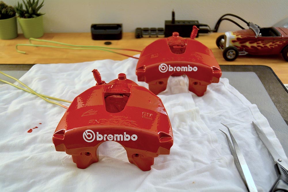 Jdeme na brzdy. O víkendu proběhlo vybroušení, lakování, polepení a znovu lakování nových brzdičů, včera odborná montáž, výměna brzdové kapaliny a odvzdušnění v servisu a dnes postupné zahoření nových brzd na autě dle doporučení výrobce Brembo.
