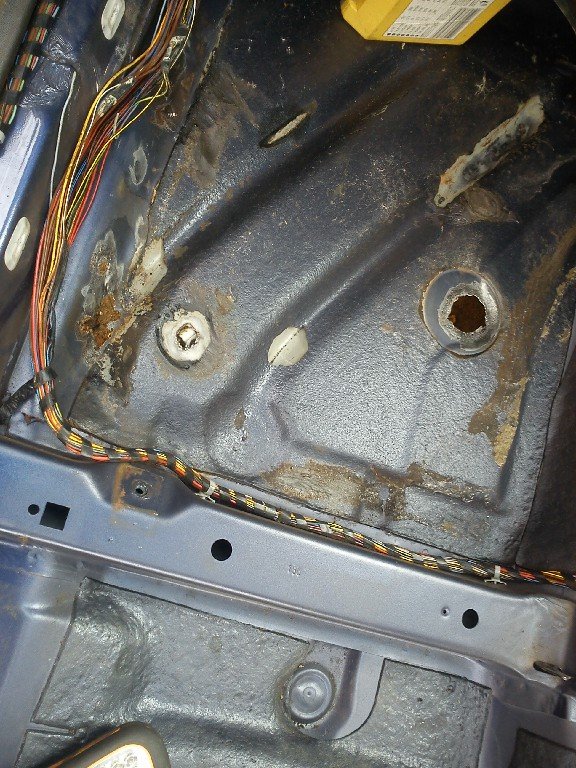 Kdysi bylo auto stříkano zespod bodyčkem nebo čím, a u rizikových míst jako jsou záslepky, nebo vruty držící plastové lišty kabelů(prostě všechna narušení celistvosti podlahy) to začlo hnít. Byly taky lehce vyhnitá zadní pravá kapsa, tam kde je klapka odvětrání.Obě kapsy jsem vylil olejem, do prahů jsem nastříkal rezistin ve spreji.