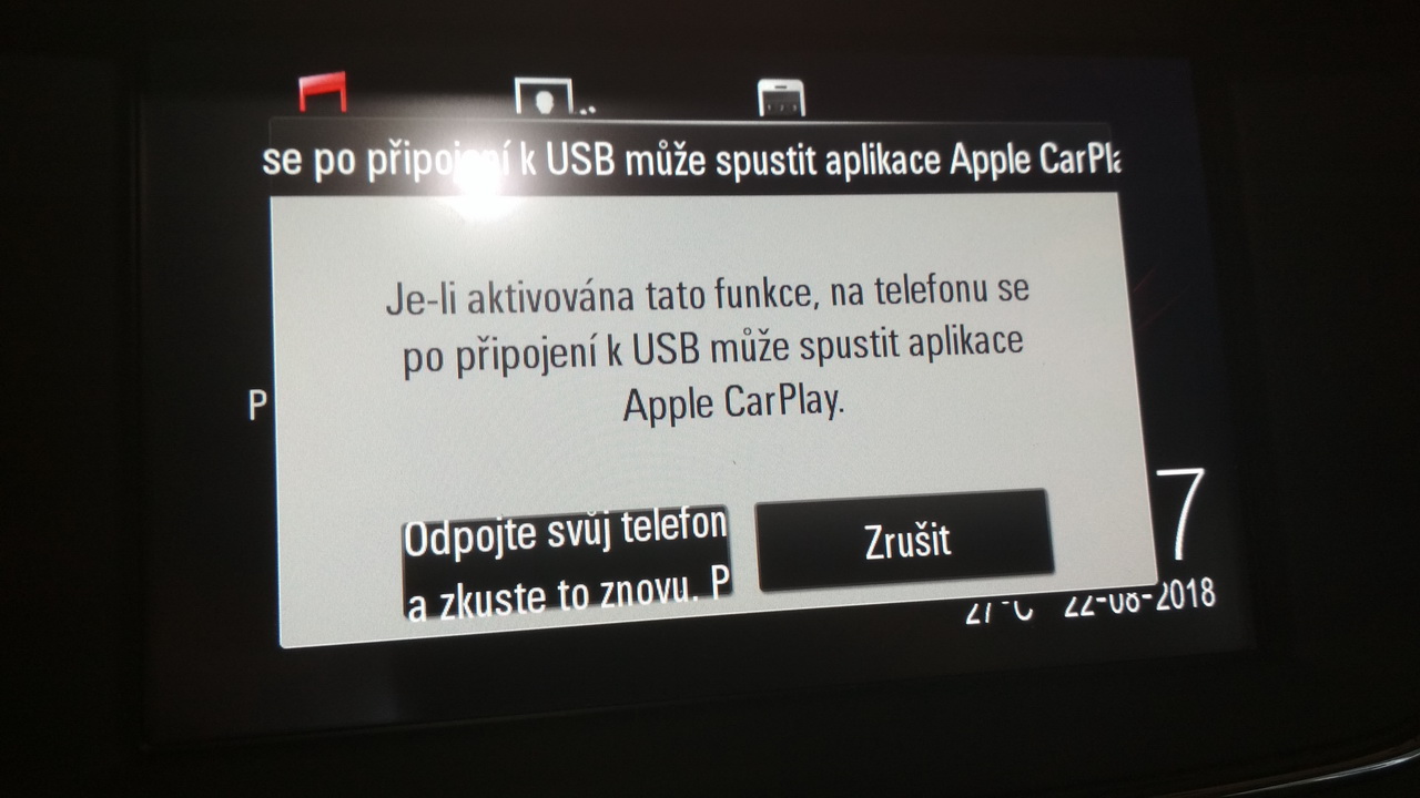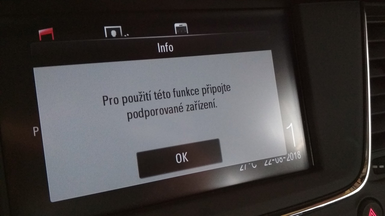 Bohužel nejede. Ještě to někdy hází druhou hlášku o připojení podporovaného zařízení. Zkoušel jsem i Xiaomi Redmi Note 4 a stejný výsledek. Přijde mi, že problém je spíš v autě než v mobilu, protože při připojení k autu se Android Auto v mobilu spustí, ale Astra telefon zřejmě vůbec nedetekuje (nejede ani galerie).