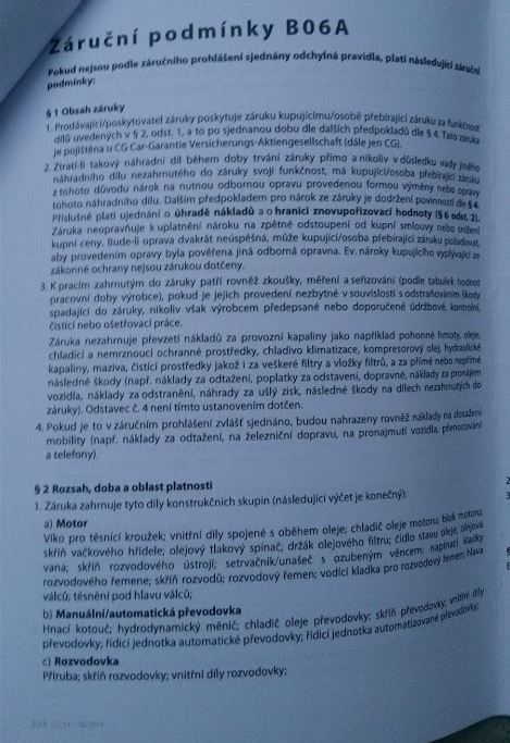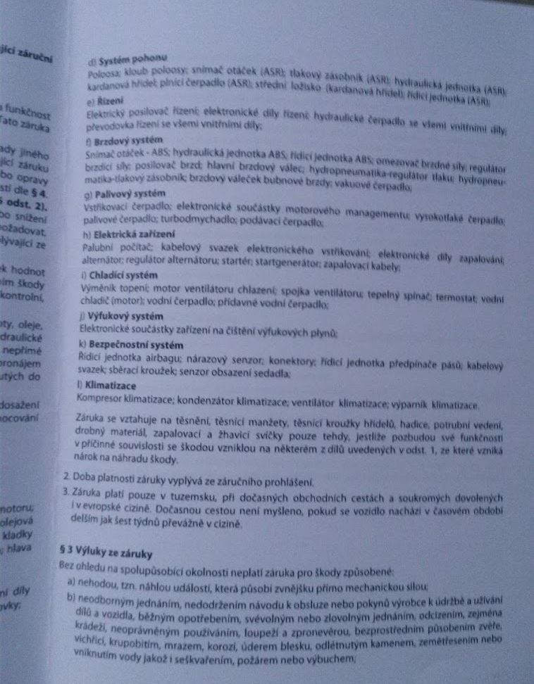 - Mají tam přesně vyjmenované součástky na které se záruka vztahuje odpovídající zhruba 15 let starému autu. Tzn. nevztahuje se prakticky na žádnou elektroniku (přední kamera, různé asistenty, led matrix, elektrické sedačky) u které bych se bál, že odejdou nejvíc.