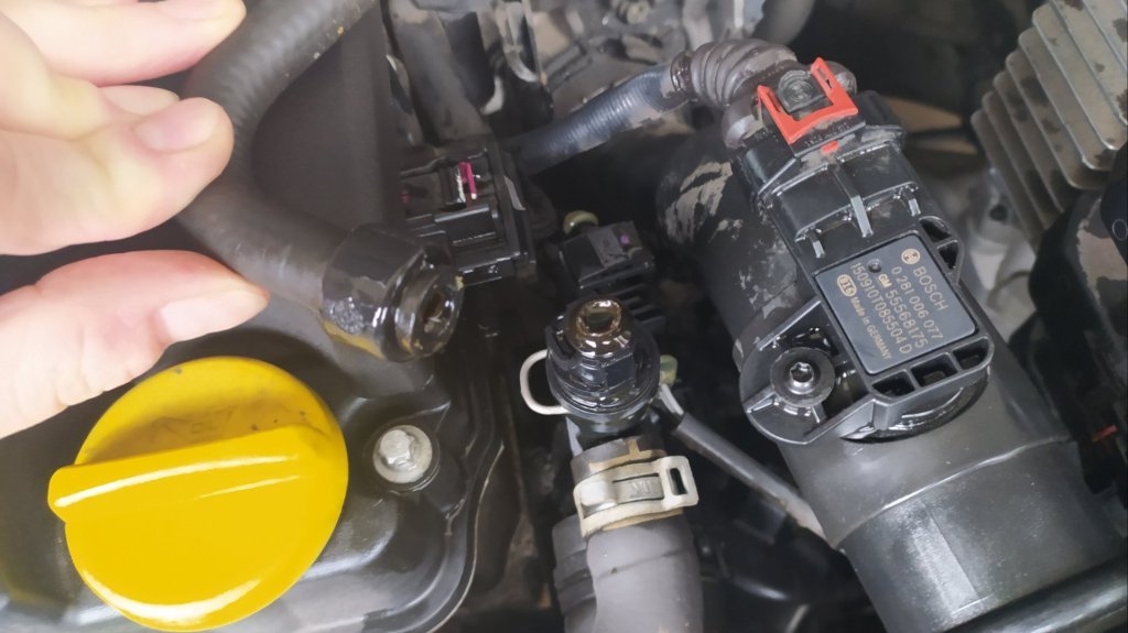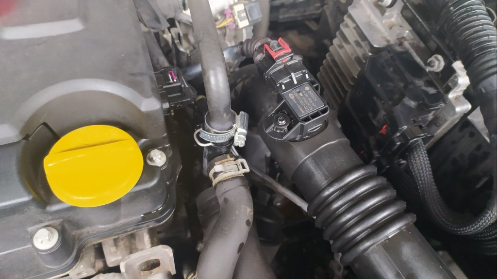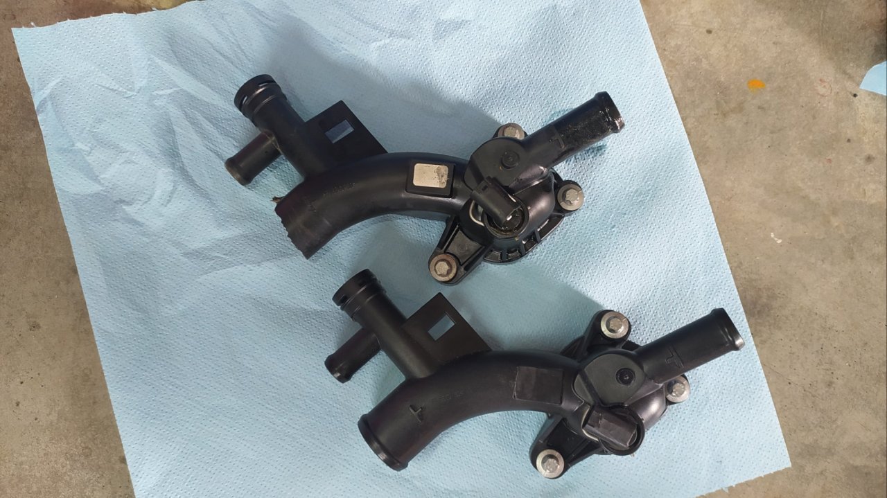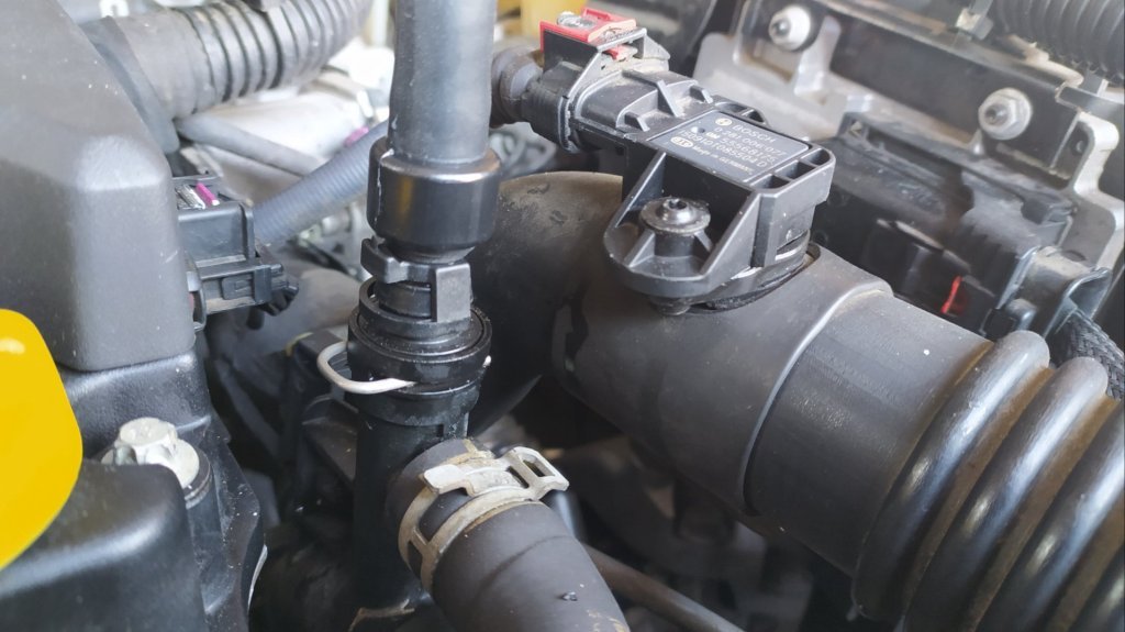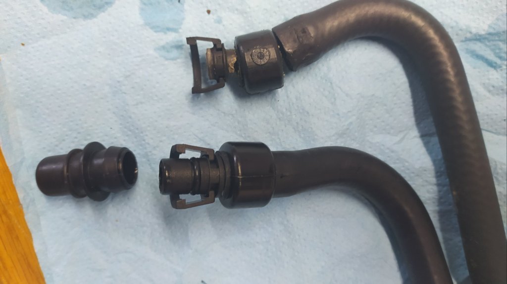 Abych mohl nouzově dojet pro novou, uřízl jsem zesílený konec původní hadice a nacpal ho na nátrubek který je na mezikusu do termostatu a zaškrtil páskou. Koupil jsem z cenových důvodů bežně dostupnou neoriginální hadičku za 250,- vyměnil a je to ok.