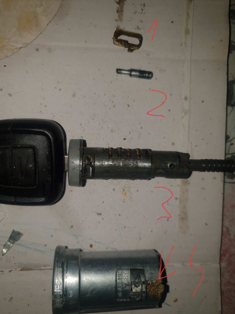 Nakolko kluc saNedal otocit, ani istiaci kolik (2. na fotke) sa nedal vybrat standardne, z opacnej strany, tak som musel vypilit otvor (vid 4.), odtial vybral ten kolik, a v pohode vysla vlozka s jazyckami (vid 3.). Trvalo mi to dlho vyriesit rebus, ale nakolko klucom sa nedalo ani do polohy 1.otocit, nic nepomahalo, ani poriadne precistenie wd-ckom. Jasne ze vycnievali tie jazycky (vid.1), su zo zlteho materialu, s pilnikom som ich skosil a na fotky (vid 3.) Uz vobec nevycnievaju pri zasunutom kluci, uplne lahucko sa toci vlozka. Ten vypileny otvorik som zarobil tekutym kovom nechal vytvrdit (vid 4.). Namastil, poskladal, kolik (vid 2.) zasunul riadne z opacnej strany ako sa ma, a zajtra sa sklada spat vsetko vratane volantu (aj s tym som sa moril po 2dni pri -10° v aute ho vybrat). Velmi pracne, vela dni stravenych v aute ale som si zachoval origy kluc, nic nevylamoval, nepilil. Ak by niekomu pomohlo.