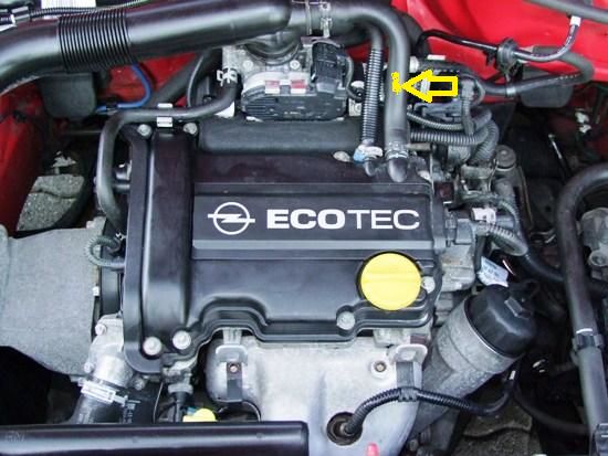 Všiml jsem si, že gumová trubka vedoucí ke klapce - viz žlutá šipka na foto (není to náš motor) byla prolomená a je zalepená páskou. Nicméně toto bylo už i před opravou.