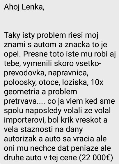 Poisťovňa vyhodnotila, že to nebola poistná udalosť, žiada peniaze späť (za výmenu nápravnice). Autorizovaný servis vzal auto späť (až 19.12), prezul na iné kolesá a rovnako ťahá do strany, urobili geometriu v inom servise (zelená), kalibrovali svoju geometriu (odborník hneď riešil moje auto) zelená, 21.12.2018 mi dali auto, že je to urobené (servisák na otázku či ide rovno, odpovedal, je to lepšie), nič nevymenili, volant mi ide trocha ťažšie (neviem čo urobili), skúšala som ho na 50km a ide rovnako do strany ako pred 2 mesiacmi....Máte niekto podobnú skúsenosť? Mám kontakt na pána (ešte mu len budem volať), ktorý mal vraj ten istý problém s Oplom a výrobca mu mení auto...nechce vrátiť peniaze....Ďakujem